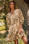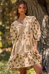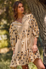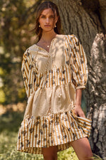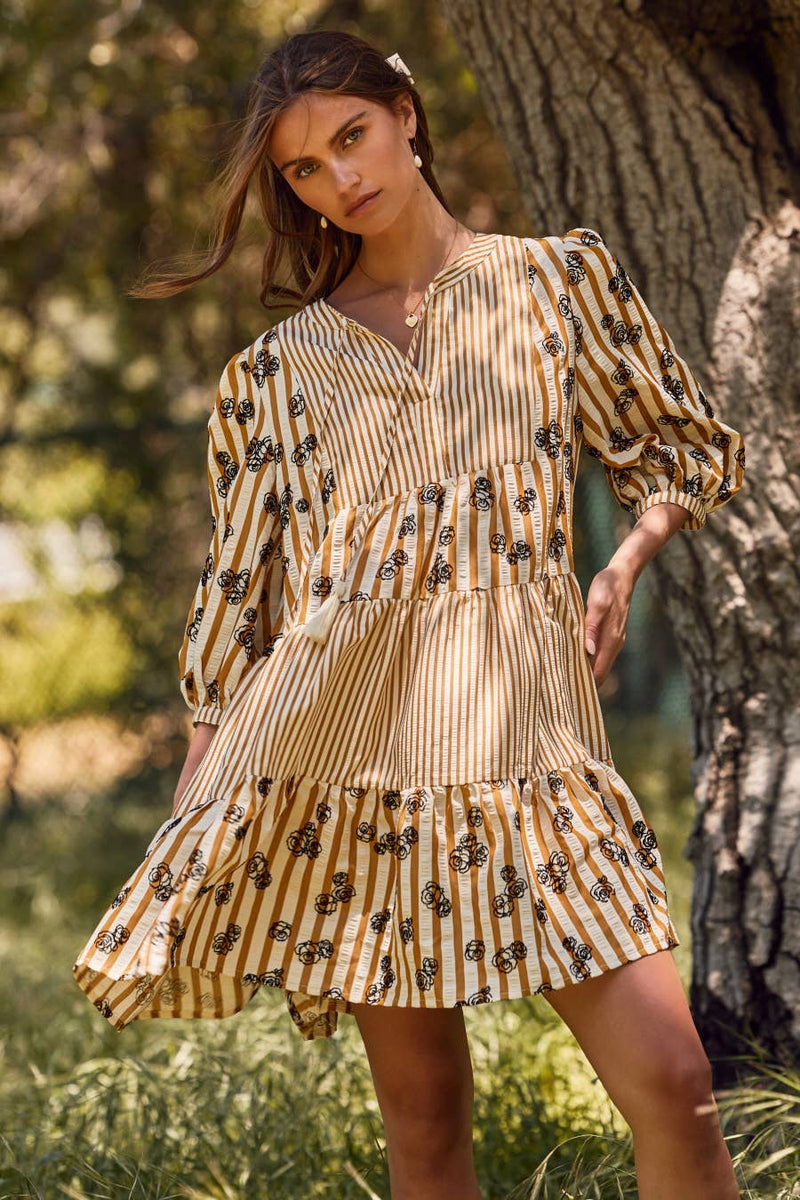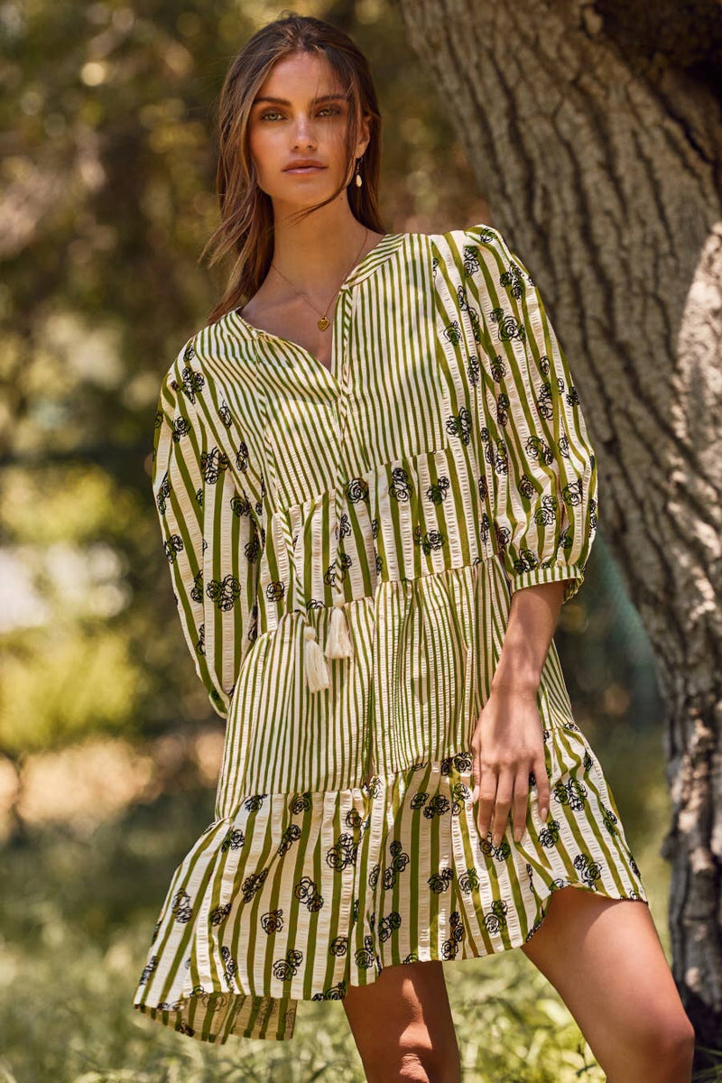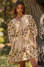 Flocked floral printed striped baby doll dress with 3/4" sleeve Also available in sizes 1XL to 3XL: Style no. ID18118P. Total Length: 35' Content: 100% Polyester