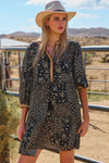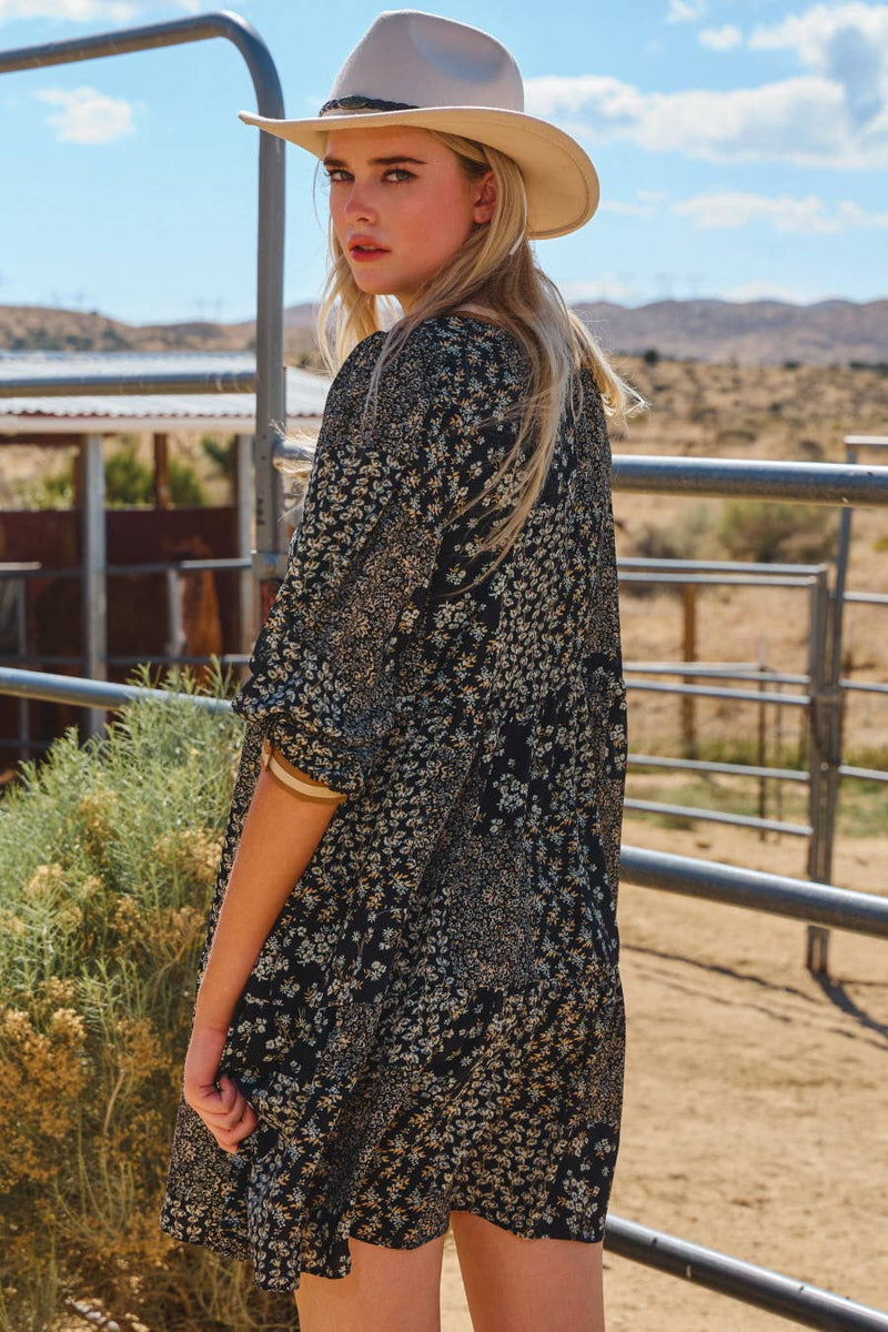 Ditsy floral printed 3/4 sleeve dress with contrast placket and cuff. Also available in sizes S to L: Style no. ID18394. Total Length: 38" Content: 100% Polyester